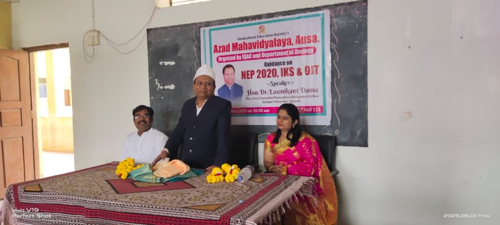 Dr. Laxmikant Dama, Pro VC Solapur University is seen addressing the students & faculty members in One Day Workshop on NEP 2020 IKS & OJT